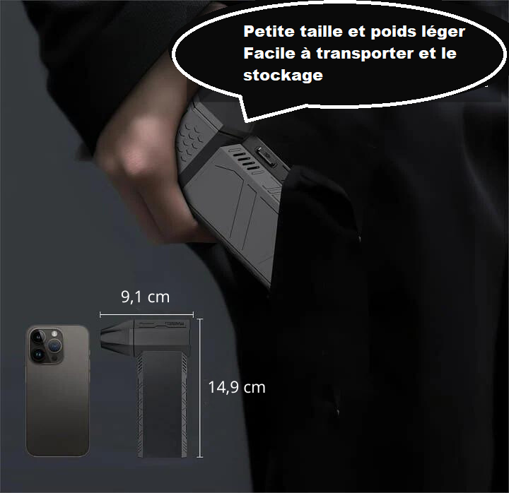 Notre turbo-ventilateur portable offre un puissant flux d'air pour vous garder au frais. Grâce à son design compact, léger et facile à transporter, vous pouvez profiter d'une brise rafraîchissante partout où vous allez. Il est parfait pour les activités de plein air telles que les pique-niques, le sport et le camping.